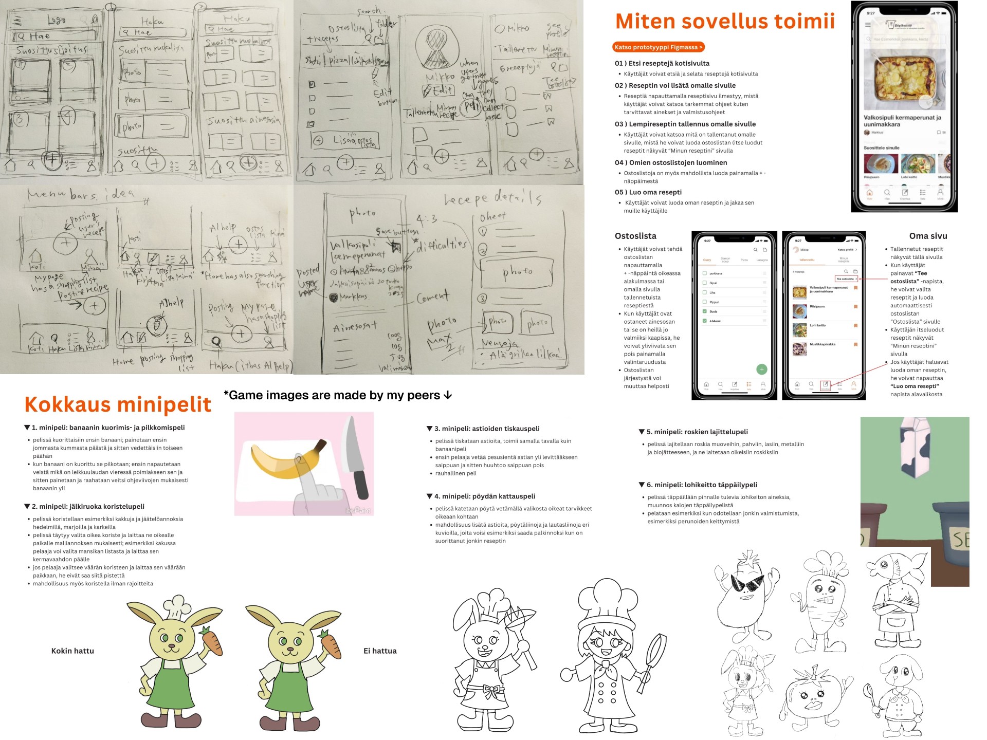 To differentiate Digikeittiö's UIUX, I have benchmarked famous cooking apps in Japan. We also considered a chef character design that would appeal to young people. At the same time, we also proposed some cooking mini-game ideas.